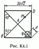 Решение контрольной К4 Вариант 12. Задание для задачи К4: Прямоугольная пластина (рис. К4.0 — К4.4) или круглая пластина радиуса R = 60 см (рис. К4.5 — К4.9) вращается вокруг неподвижной оси по закону фи = f1(t), заданному в табл. К4. Положительное направление отсчета угла фи показано на рисунках дуговой стрелкой. На рис. 0, 1, 2, 5, 6 ось вращения перпендикулярна плоскости пластины и проходит через точку О (пластина вращается в своей плоскости); на рис. 3, 4, 7, 8, 9 ось вращения OO1 лежит в плоскости пластины (пластина вращается в пространстве). По пластине вдоль прямой BD (рис. 0—4) или по окружности радиуса R (рис. 5—9) движется точка М; закон относительного движения, т.е. зависимость s = AM = f2(t) (s выражена в сантиметрах, t — в секундах), задан в таблице отдельно для рис. 0—4 и для рис. 5—9; там же даны размеры b и l. На всех рисунках точка М показана в положении, при котором s = АМ>0 (при s<0 точка М находится по другую сторону от точки А). Необходимо найти абсолютную скорость и абсолютное ускорение точки М в момент времени t1 = 1 с.
