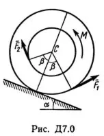 Решение задачи Д7 Вариант 02 - по термеху из Тарга С.М. 1989 года. Условие к задаче Динамика 7 (страница 78): Барабан радиуса R весом P имеет выточку (как у катушки) радиуса r = 0,6R (рис. Д7.0 — Д7.9, табл. Д7). К концам намотанных на барабан нитей приложены постоянные силы F1 и F2, направления которых определяются углом Бетта; кроме сил на барабан действует пара с моментом М; когда в таблице М<0, направление момента противоположно показанному на рисунке. При движении, начинающемся из состояния покоя, барабан катится без скольжения по шероховатой наклонной плоскости с углом наклона α так, как показано на рисунках. Пренебрегая сопротивлением качению, определить закон движения центра масс С барабана, т. е. xC = f(t), и наименьшее значение коэффициента трения f о плоскость, при котором возможно качение без скольжения. Барабан рассматривать как сплошной однородный цилиндр радиуса R.