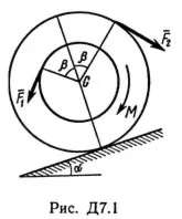 Решение задачи Д7 Вариант 18 - по термеху из Тарга С.М. 1989 года. Условие к задаче Динамика 7 (страница 78): Барабан радиуса R весом P имеет выточку (как у катушки) радиуса r = 0,6R (рис. Д7.0 — Д7.9, табл. Д7). К концам намотанных на барабан нитей приложены постоянные силы F1 и F2, направления которых определяются углом Бетта; кроме сил на барабан действует пара с моментом М; когда в таблице М<0, направление момента противоположно показанному на рисунке. При движении, начинающемся из состояния покоя, барабан катится без скольжения по шероховатой наклонной плоскости с углом наклона α так, как показано на рисунках. Пренебрегая сопротивлением качению, определить закон движения центра масс С барабана, т. е. xC = f(t), и наименьшее значение коэффициента трения f о плоскость, при котором возможно качение без скольжения. Барабан рассматривать как сплошной однородный цилиндр радиуса R.