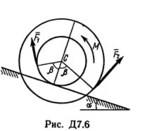 Решение задачи Д7 Вариант 64 - по термеху из Тарга С.М. 1989 года. Условие к задаче Динамика 7 (страница 78): Барабан радиуса R весом P имеет выточку (как у катушки) радиуса r = 0,6R (рис. Д7.0 — Д7.9, табл. Д7). К концам намотанных на барабан нитей приложены постоянные силы F1 и F2, направления которых определяются углом Бетта; кроме сил на барабан действует пара с моментом М; когда в таблице М<0, направление момента противоположно показанному на рисунке. При движении, начинающемся из состояния покоя, барабан катится без скольжения по шероховатой наклонной плоскости с углом наклона α так, как показано на рисунках. Пренебрегая сопротивлением качению, определить закон движения центра масс С барабана, т. е. xC = f(t), и наименьшее значение коэффициента трения f о плоскость, при котором возможно качение без скольжения. Барабан рассматривать как сплошной однородный цилиндр радиуса R.