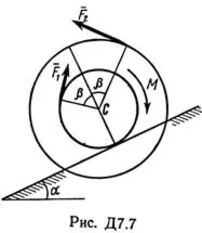 Решение задачи Д7 Вариант 78 - по термеху из Тарга С.М. 1989 года. Условие к задаче Динамика 7 (страница 78): Барабан радиуса R весом P имеет выточку (как у катушки) радиуса r = 0,6R (рис. Д7.0 — Д7.9, табл. Д7). К концам намотанных на барабан нитей приложены постоянные силы F1 и F2, направления которых определяются углом Бетта; кроме сил на барабан действует пара с моментом М; когда в таблице М<0, направление момента противоположно показанному на рисунке. При движении, начинающемся из состояния покоя, барабан катится без скольжения по шероховатой наклонной плоскости с углом наклона α так, как показано на рисунках. Пренебрегая сопротивлением качению, определить закон движения центра масс С барабана, т. е. xC = f(t), и наименьшее значение коэффициента трения f о плоскость, при котором возможно качение без скольжения. Барабан рассматривать как сплошной однородный цилиндр радиуса R.