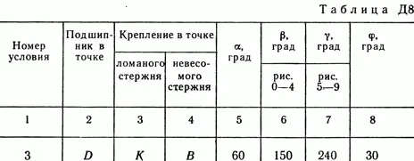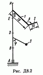 Решение задачи Д8 Вариант 23 - по термеху из Тарга С.М. 1989 года. Условие к задаче Динамика 8 (страница 78): Вертикальный вал АК (рис. Д8.0 — Д8.9), вращающийся с постоянной угловой скоростью омега = 10 с-1, закреплен подпятником в точке A и цилиндрическим подшипником в точке, указанной в табл. Д8 в столбце 2 (АВ = BD = DE = ЕК = a). К валу жестко прикреплены тонкий однородный ломаный стержень массой m = 10 кг, состоящий из частей 1 и 2 (размеры частей стержня показаны на рисунках, где b = 0,1 м, а их массы m1 и m2 пропорциональны длинам), и невесомый стержень длиной l = 4b с точечной массой m3 = 3 кг на конце; оба стержня лежат в одной плоскости. Точки крепления стержней указаны в таблице в столбцах 3 и 4, а углы альфа, бетта, сигма, фи даны в столбцах 5—8. Пренебрегая весом вала, определить реакции подпятника и подшипника. При подсчетах принять а = 0,6 м.
