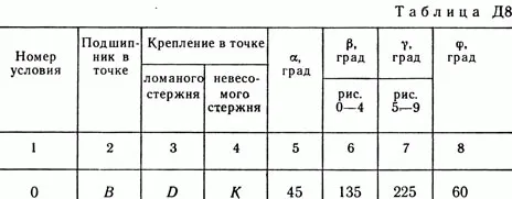 Решение задачи Д8 Вариант 30 - по термеху из Тарга С.М. 1989 года. Условие к задаче Динамика 8 (страница 78): Вертикальный вал АК (рис. Д8.0 — Д8.9), вращающийся с постоянной угловой скоростью омега = 10 с-1, закреплен подпятником в точке A и цилиндрическим подшипником в точке, указанной в табл. Д8 в столбце 2 (АВ = BD = DE = ЕК = a). К валу жестко прикреплены тонкий однородный ломаный стержень массой m = 10 кг, состоящий из частей 1 и 2 (размеры частей стержня показаны на рисунках, где b = 0,1 м, а их массы m1 и m2 пропорциональны длинам), и невесомый стержень длиной l = 4b с точечной массой m3 = 3 кг на конце; оба стержня лежат в одной плоскости. Точки крепления стержней указаны в таблице в столбцах 3 и 4, а углы альфа, бетта, сигма, фи даны в столбцах 5—8. Пренебрегая весом вала, определить реакции подпятника и подшипника. При подсчетах принять а = 0,6 м.