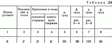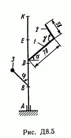 Решение задачи Д8 Вариант 56 - по термеху из Тарга С.М. 1989 года. Условие к задаче Динамика 8 (страница 78): Вертикальный вал АК (рис. Д8.0 — Д8.9), вращающийся с постоянной угловой скоростью омега = 10 с-1, закреплен подпятником в точке A и цилиндрическим подшипником в точке, указанной в табл. Д8 в столбце 2 (АВ = BD = DE = ЕК = a). К валу жестко прикреплены тонкий однородный ломаный стержень массой m = 10 кг, состоящий из частей 1 и 2 (размеры частей стержня показаны на рисунках, где b = 0,1 м, а их массы m1 и m2 пропорциональны длинам), и невесомый стержень длиной l = 4b с точечной массой m3 = 3 кг на конце; оба стержня лежат в одной плоскости. Точки крепления стержней указаны в таблице в столбцах 3 и 4, а углы альфа, бетта, сигма, фи даны в столбцах 5—8. Пренебрегая весом вала, определить реакции подпятника и подшипника. При подсчетах принять а = 0,6 м.