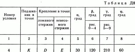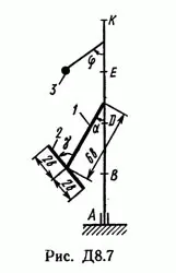 Решение задачи Д8 Вариант 74 - по термеху из Тарга С.М. 1989 года. Условие к задаче Динамика 8 (страница 78): Вертикальный вал АК (рис. Д8.0 — Д8.9), вращающийся с постоянной угловой скоростью омега = 10 с-1, закреплен подпятником в точке A и цилиндрическим подшипником в точке, указанной в табл. Д8 в столбце 2 (АВ = BD = DE = ЕК = a). К валу жестко прикреплены тонкий однородный ломаный стержень массой m = 10 кг, состоящий из частей 1 и 2 (размеры частей стержня показаны на рисунках, где b = 0,1 м, а их массы m1 и m2 пропорциональны длинам), и невесомый стержень длиной l = 4b с точечной массой m3 = 3 кг на конце; оба стержня лежат в одной плоскости. Точки крепления стержней указаны в таблице в столбцах 3 и 4, а углы альфа, бетта, сигма, фи даны в столбцах 5—8. Пренебрегая весом вала, определить реакции подпятника и подшипника. При подсчетах принять а = 0,6 м.