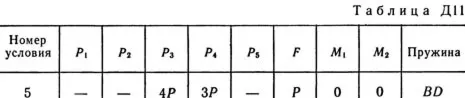 Решение задачи по теормеху из решебника С.М. Тарга 1989 г. Д11 Вариант 05. Условие к задаче Динамика 11 (Полное условие на странице 95): Механическая система состоит из тел 1, 2, …, 5 весом P1, Р2, …, P5 соответственно, связанных друг с другом нитями, намотанными на ступенчатые блоки 1 и 2 (рис. Д11.0 — Д11.9, табл. Д11). Радиусы ступенчатых блоков 1 и 2 равны соответственно R1 = R, r1 = 0,4R, R2 = R, r2 = 0,8R. При вычислении моментов инерции все блоки, катки и колеса считать однородными сплошными цилиндрами радиуса R. На систему кроме сил тяжести действует сила F, приложенная к телу 3 или 4 (если тело 3 в систему не входит, сила приложена в точке В к тележке), и пары сил с моментами М1, M2, приложенные к блокам 1 и 2; когда М<0, направление момента противоположно показанному на рисунке. На участке нити, указанном в таблице в столбце «Пружина», включена пружина с коэффициентом жесткости с (например, если в столбце стоит АВ, то участок АВ является пружиной, если AD, то AD — пружина и т.д.); в начальный момент времени пружина не деформирована. Составить для системы уравнения Лагранжа и найти закон изменения обобщенной координаты x, т. е. x = f(t), считая, что движение начинается из состояния покоя; определить также частоту и период колебаний, совершаемых телами системы при ее движении (о выборе координаты x см. «Указания»). Прочерк в столбцах таблицы, где заданы веса, означает, что соответствующее тело в систему не входит (на чертеже не изображать), а ноль — что тело считается невесомым, но в систему входит; для колес, обозначенных номером 4, Р4 — их общий вес (вес платформы такой тележки не учитывается).