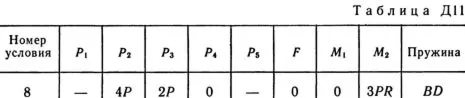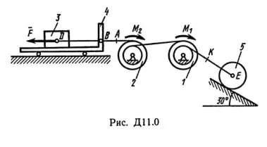 Решение задачи по теормеху из решебника С.М. Тарга 1989 г. Д11 Вариант 08. Условие к задаче Динамика 11 (Полное условие на странице 95): Механическая система состоит из тел 1, 2, …, 5 весом P1, Р2, …, P5 соответственно, связанных друг с другом нитями, намотанными на ступенчатые блоки 1 и 2 (рис. Д11.0 — Д11.9, табл. Д11). Радиусы ступенчатых блоков 1 и 2 равны соответственно R1 = R, r1 = 0,4R, R2 = R, r2 = 0,8R. При вычислении моментов инерции все блоки, катки и колеса считать однородными сплошными цилиндрами радиуса R. На систему кроме сил тяжести действует сила F, приложенная к телу 3 или 4 (если тело 3 в систему не входит, сила приложена в точке В к тележке), и пары сил с моментами М1, M2, приложенные к блокам 1 и 2; когда М<0, направление момента противоположно показанному на рисунке. На участке нити, указанном в таблице в столбце «Пружина», включена пружина с коэффициентом жесткости с (например, если в столбце стоит АВ, то участок АВ является пружиной, если AD, то AD — пружина и т.д.); в начальный момент времени пружина не деформирована. Составить для системы уравнения Лагранжа и найти закон изменения обобщенной координаты x, т. е. x = f(t), считая, что движение начинается из состояния покоя; определить также частоту и период колебаний, совершаемых телами системы при ее движении (о выборе координаты x см. «Указания»). Прочерк в столбцах таблицы, где заданы веса, означает, что соответствующее тело в систему не входит (на чертеже не изображать), а ноль — что тело считается невесомым, но в систему входит; для колес, обозначенных номером 4, Р4 — их общий вес (вес платформы такой тележки не учитывается).