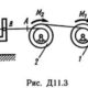 Решение задачи по теормеху из решебника С.М. Тарга 1989 г. Д11 Вариант 34. Условие к задаче Динамика 11 (Полное условие на странице 95): Механическая система состоит из тел 1, 2, …, 5 весом P1, Р2, …, P5 соответственно, связанных друг с другом нитями, намотанными на ступенчатые блоки 1 и 2 (рис. Д11.0 — Д11.9, табл. Д11). Радиусы ступенчатых блоков 1 и 2 равны соответственно R1 = R, r1 = 0,4R, R2 = R, r2 = 0,8R. При вычислении моментов инерции все блоки, катки и колеса считать однородными сплошными цилиндрами радиуса R. На систему кроме сил тяжести действует сила F, приложенная к телу 3 или 4 (если тело 3 в систему не входит, сила приложена в точке В к тележке), и пары сил с моментами М1, M2, приложенные к блокам 1 и 2; когда М<0, направление момента противоположно показанному на рисунке. На участке нити, указанном в таблице в столбце «Пружина», включена пружина с коэффициентом жесткости с (например, если в столбце стоит АВ, то участок АВ является пружиной, если AD, то AD — пружина и т.д.); в начальный момент времени пружина не деформирована. Составить для системы уравнения Лагранжа и найти закон изменения обобщенной координаты x, т. е. x = f(t), считая, что движение начинается из состояния покоя; определить также частоту и период колебаний, совершаемых телами системы при ее движении (о выборе координаты x см. «Указания»). Прочерк в столбцах таблицы, где заданы веса, означает, что соответствующее тело в систему не входит (на чертеже не изображать), а ноль — что тело считается невесомым, но в систему входит; для колес, обозначенных номером 4, Р4 — их общий вес (вес платформы такой тележки не учитывается).