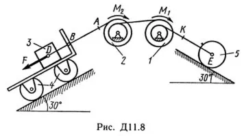 Решение задачи по теормеху из решебника С.М. Тарга 1989 г. Д11 Вариант 86. Условие к задаче Динамика 11 (Полное условие на странице 95): Механическая система состоит из тел 1, 2, …, 5 весом P1, Р2, …, P5 соответственно, связанных друг с другом нитями, намотанными на ступенчатые блоки 1 и 2 (рис. Д11.0 — Д11.9, табл. Д11). Радиусы ступенчатых блоков 1 и 2 равны соответственно R1 = R, r1 = 0,4R, R2 = R, r2 = 0,8R. При вычислении моментов инерции все блоки, катки и колеса считать однородными сплошными цилиндрами радиуса R. На систему кроме сил тяжести действует сила F, приложенная к телу 3 или 4 (если тело 3 в систему не входит, сила приложена в точке В к тележке), и пары сил с моментами М1, M2, приложенные к блокам 1 и 2; когда М<0, направление момента противоположно показанному на рисунке. На участке нити, указанном в таблице в столбце «Пружина», включена пружина с коэффициентом жесткости с (например, если в столбце стоит АВ, то участок АВ является пружиной, если AD, то AD — пружина и т.д.); в начальный момент времени пружина не деформирована. Составить для системы уравнения Лагранжа и найти закон изменения обобщенной координаты x, т. е. x = f(t), считая, что движение начинается из состояния покоя; определить также частоту и период колебаний, совершаемых телами системы при ее движении (о выборе координаты x см. «Указания»). Прочерк в столбцах таблицы, где заданы веса, означает, что соответствующее тело в систему не входит (на чертеже не изображать), а ноль — что тело считается невесомым, но в систему входит; для колес, обозначенных номером 4, Р4 — их общий вес (вес платформы такой тележки не учитывается).